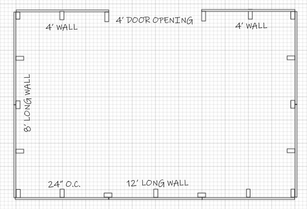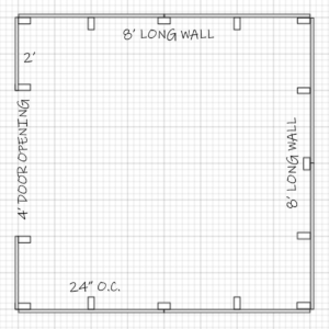 Obviously, we can put more doors in a structure, or even smaller “cut out” doors, but the first few structures we’re looking to eliminate as much waste as possible. To better stabilize the walls, we will place diagonals on the corners (not pictured in the quick blueprints).