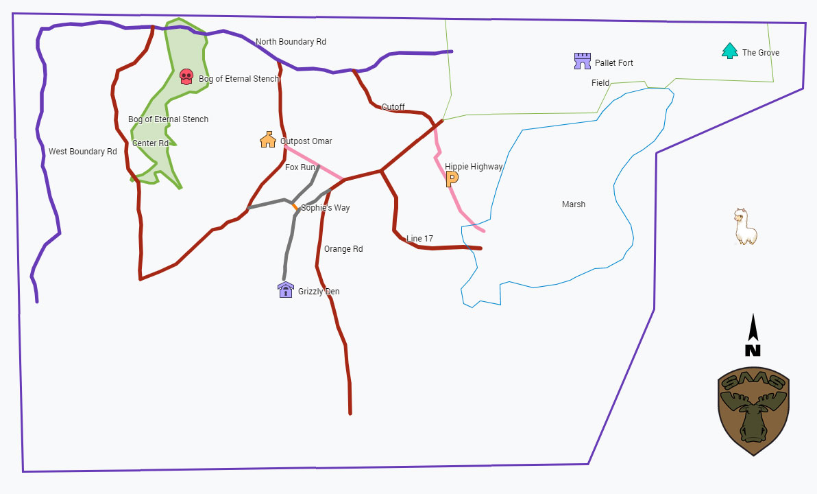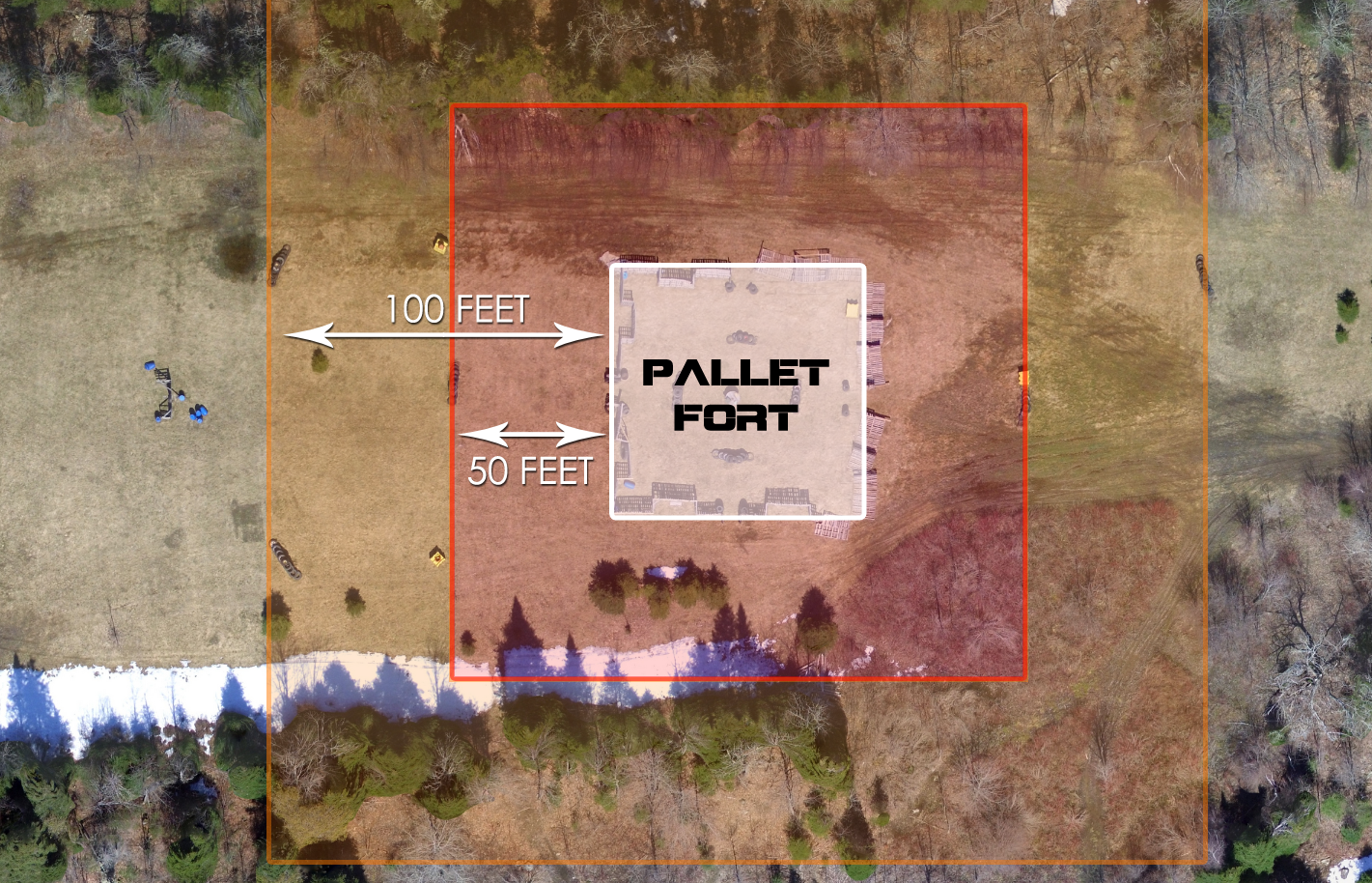 Because we are in our first years of operation, there is still a lot to be done with the field.  However, the boundary is dictated by our property lines to the north, west, and south.  The eastern boundary is as drawn to prevent one of our farm animals from being shot.  No, an airsoft BB won’t hurt them, but they aren’t wearing eyepro, nor have they signed a waiver.