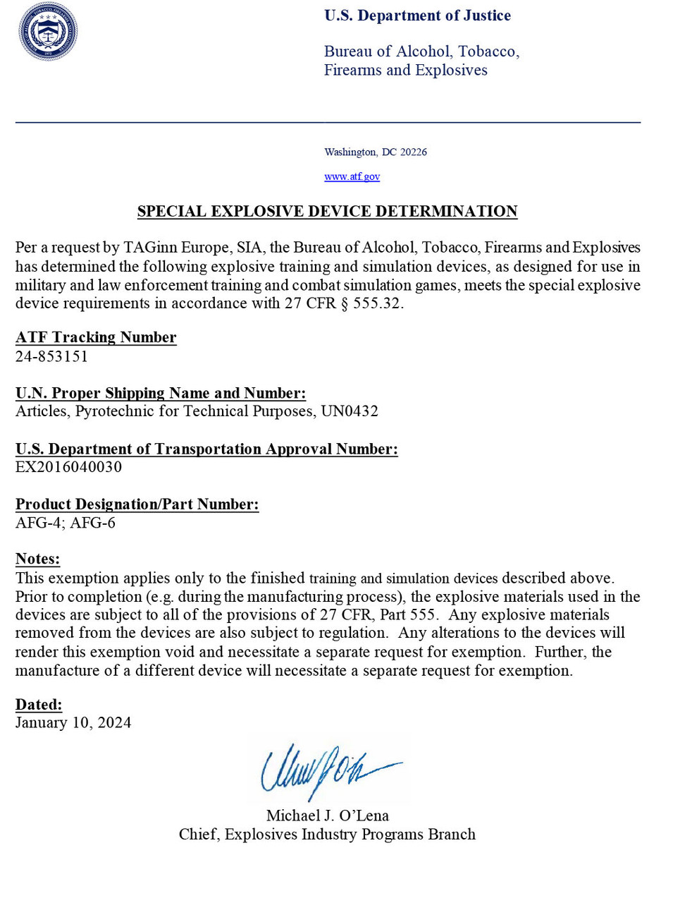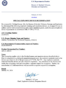 This was a fantastic business decision by Taginn, as it re-opens the US market for them (and most likely keeps the Russian market open to them as well).  However, with the ATF’s recent overreach on simulation grenades, they still had to work to get on the exemption list, which they have done.