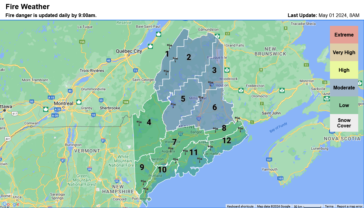 As you can see, the State is split in roughly half, with the wildfire danger being “low” in the southern part, and “moderate” in the central and northern parts. I can’t imagine the state being split into thirds or fourths, but anything is possible.